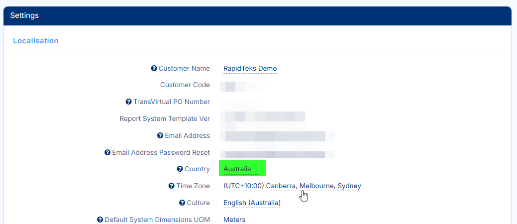 This is important as the country will dictate what suburb listing users of the account see when creating consignments/zone lists, etc.