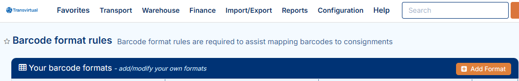 This section of TransVirtual allows Barcode Format Rules to be configured, defining the conditions under which scanned values are matched to a consignment. These rules are particularly useful when physical item barcodes differ from the barcode values stored in the system, allowing scanned values to be translated and correctly matched to a consignment.