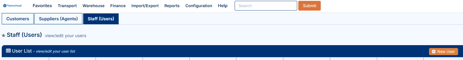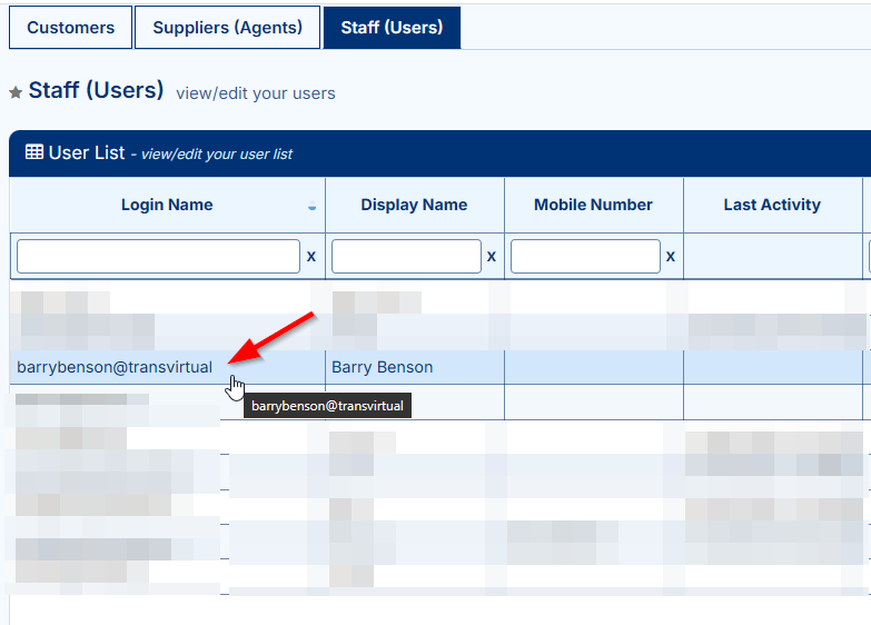 To begin, navigate to the above Page URL which is located under Transport > Configuration and Setup > Card Files (Customers/Suppliers/Staff) > Staff (Users) tab: