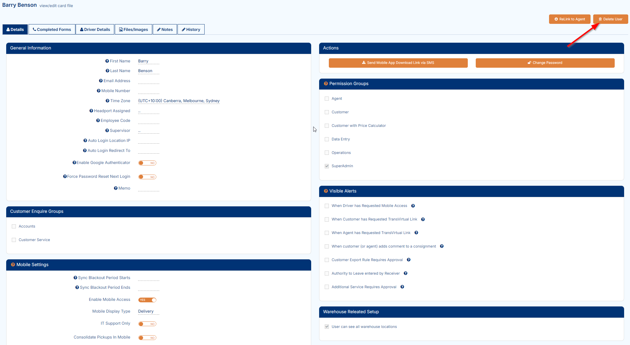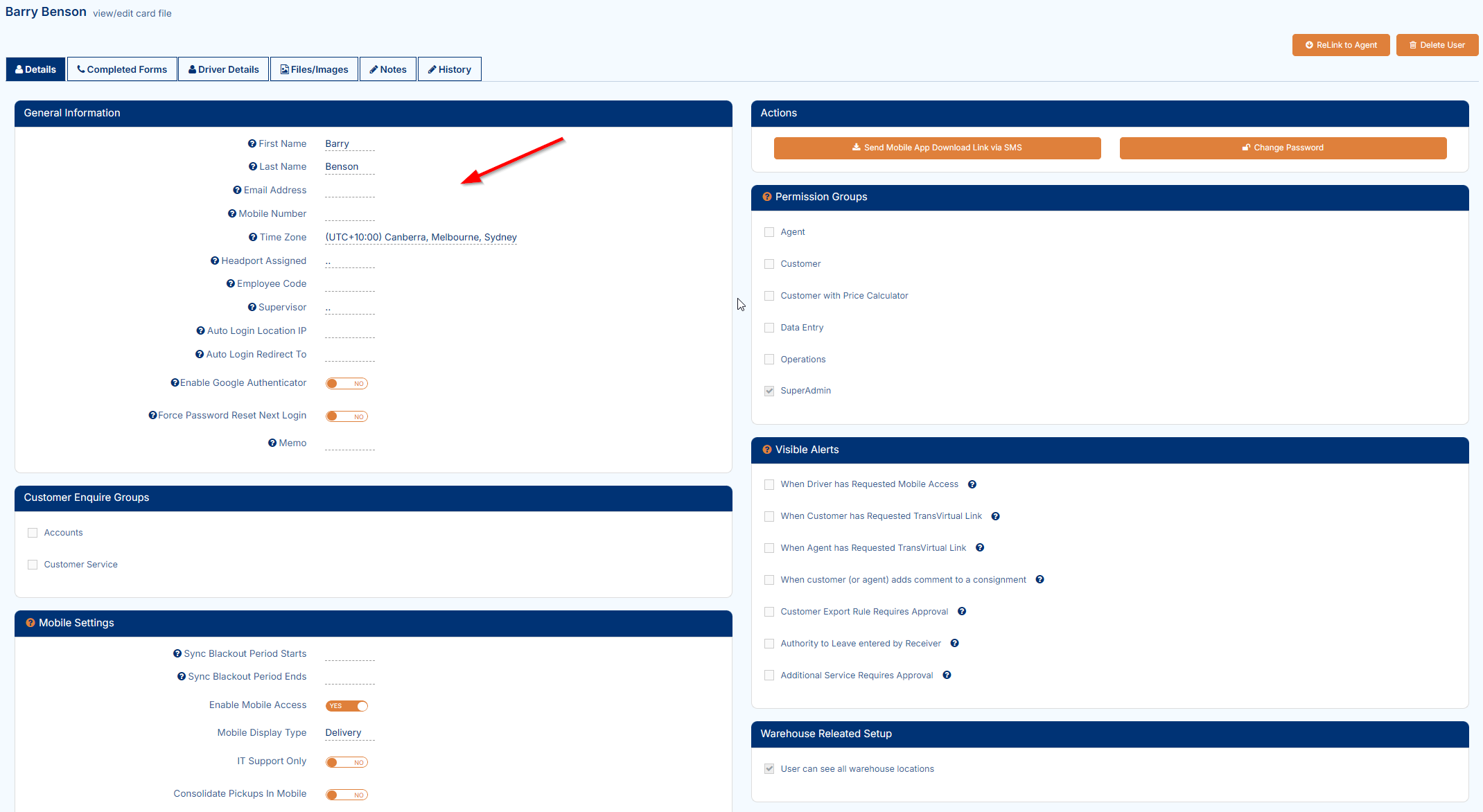Set Enable Mobile Device Access to YES if this user will require the mobile app for scanning/deliveries.