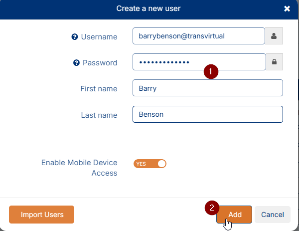 staff member name @ Transvirtual account name. For example, if a staff member named Barry Benson works for Transvirtual, the username could be