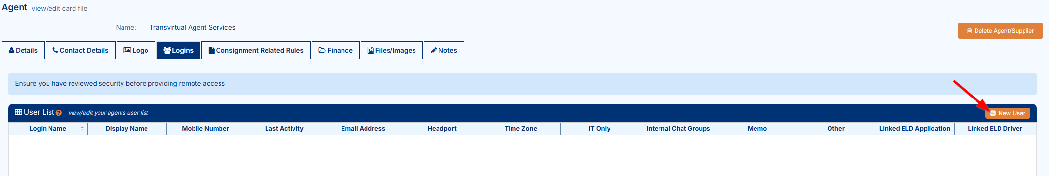 To create a login associated with an agent, first ensure the agent record has been created. Within the agent record, select the Logins tab, then click New User:
