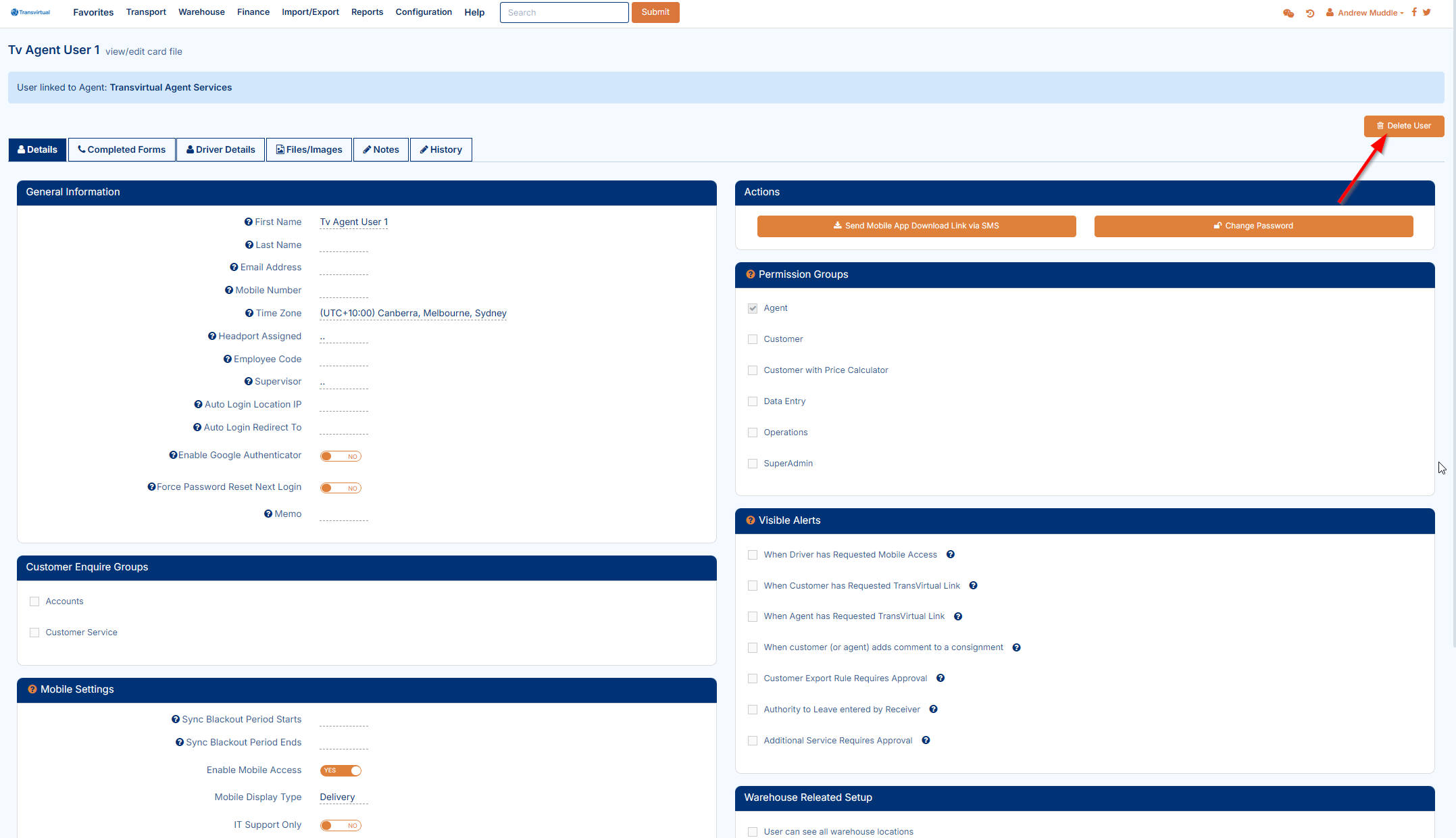 To delete an agent login, open their agent profile as outlined above, then click the Delete User button located top right: