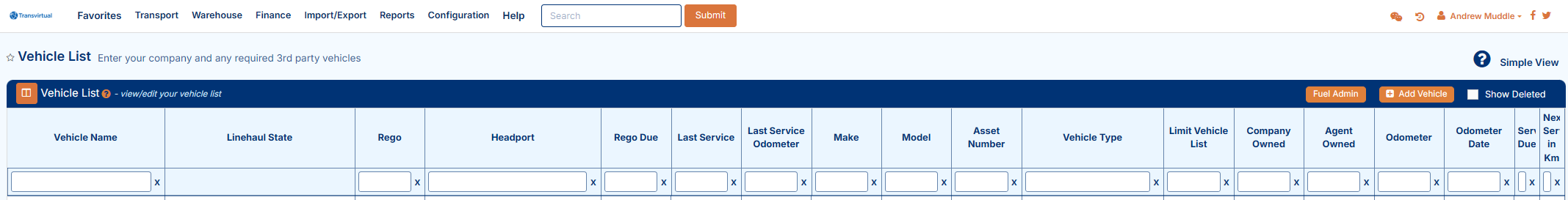 To begin, navigate to the above Page URL which is located under Transport > Configuration and Setup > Vehicle List: