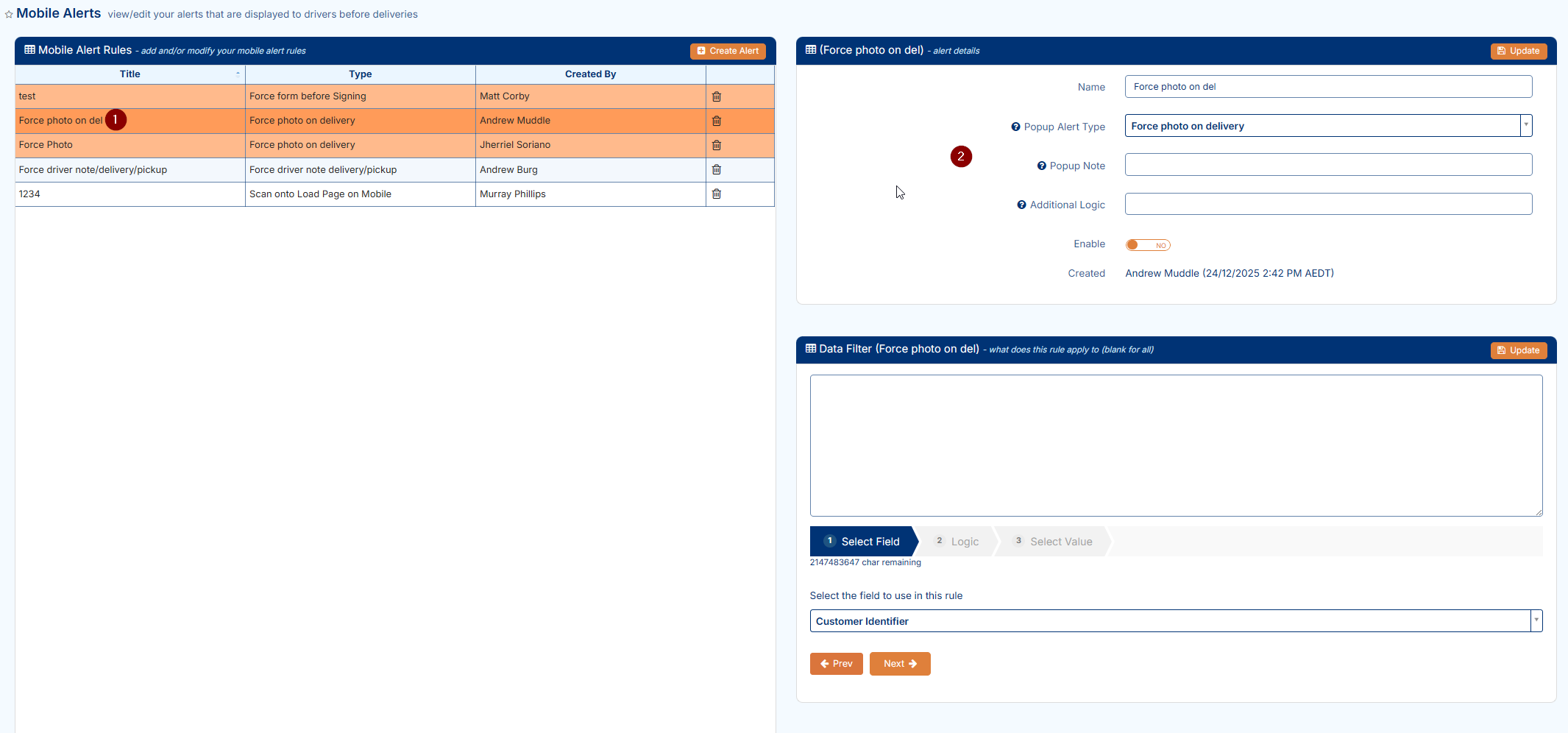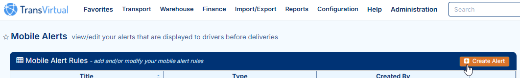 This section of Transvirtual allows users the ability to configure alerts that display on the Transvirtual mobile app. As an example, these alerts include things like forcing drivers to take photos of freight upon delivery. They are useful in ensuring that drivers comply with operational requirements of the account.
