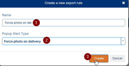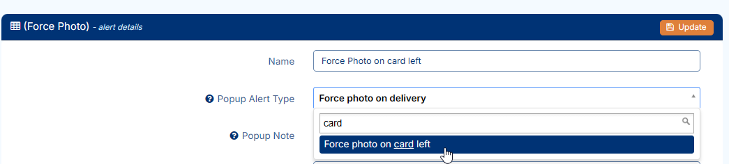 The setup for forcing a photo on card left is much the same as forcing a photo on delivery. Name the rule as required, then select this Popup Alert Type: