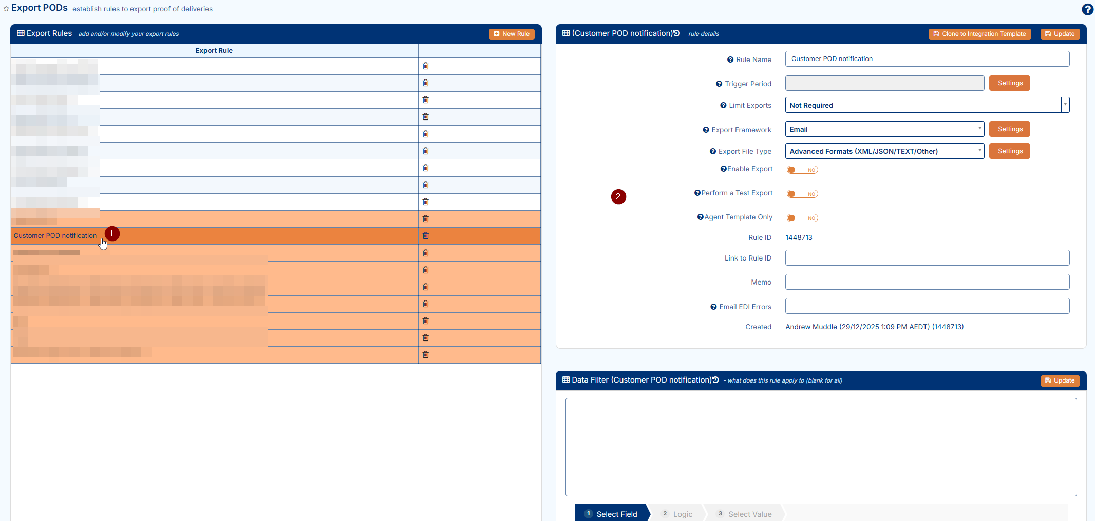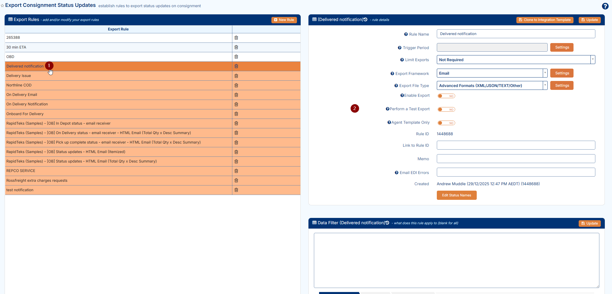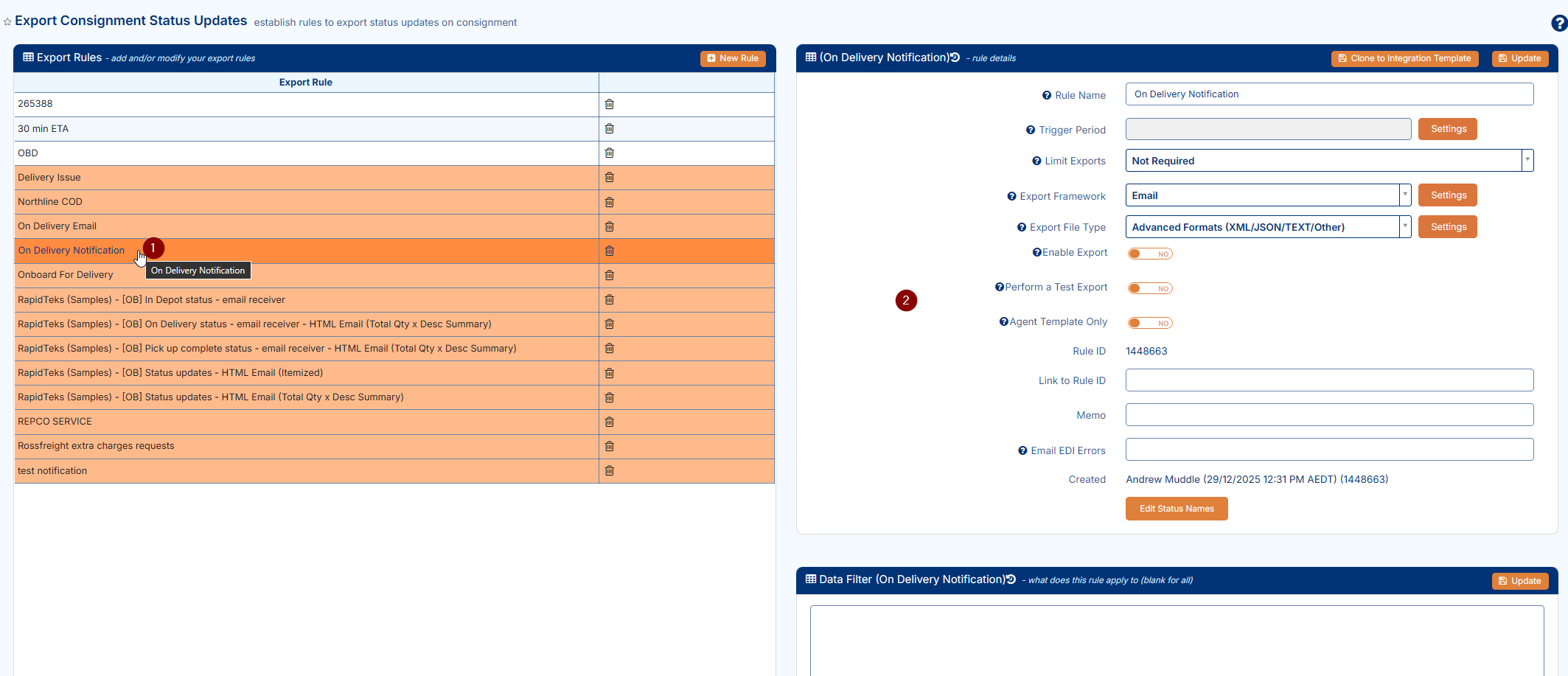 The Data Filter determines when an export is triggered and which consignments it applies to. In this example, the export triggers only when a consignment changes status to On Delivery, at which point an email is sent to the nominated recipients.