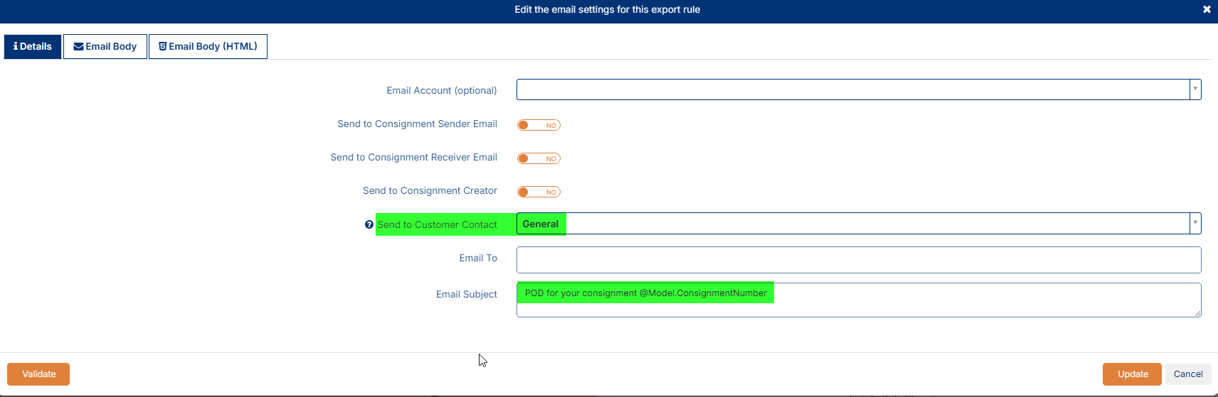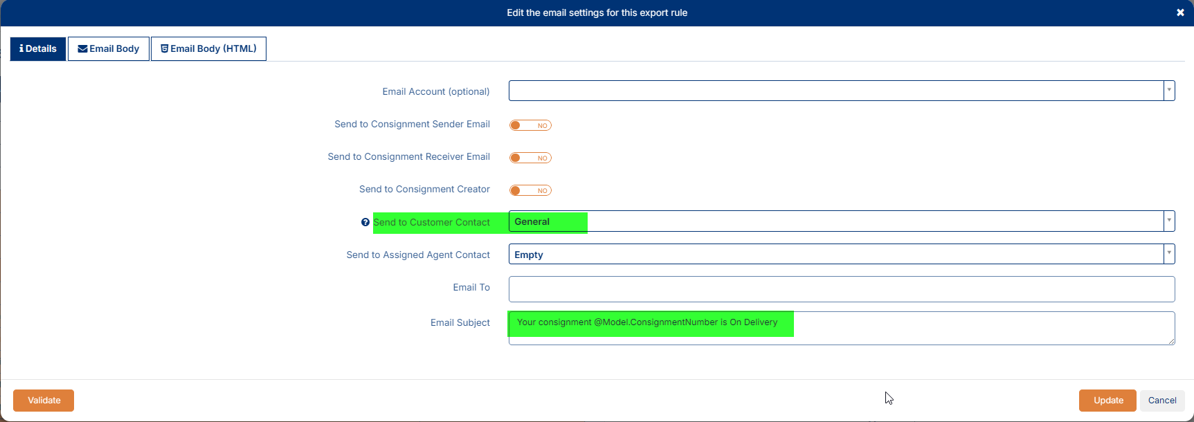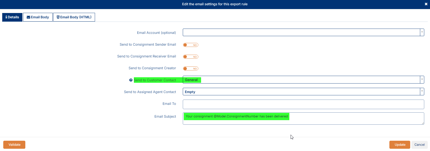 Send to Customer Contact enables a variable setup where each triggered consignment sends an email only to the customer contact associated with that consignment’s customer card.
