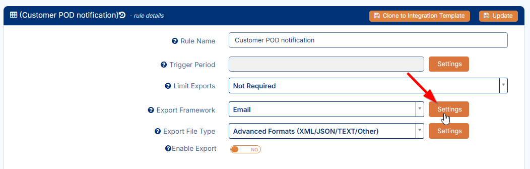 Once created, the export rule will appear in the grid. Click on it to expose additional settings on the right: