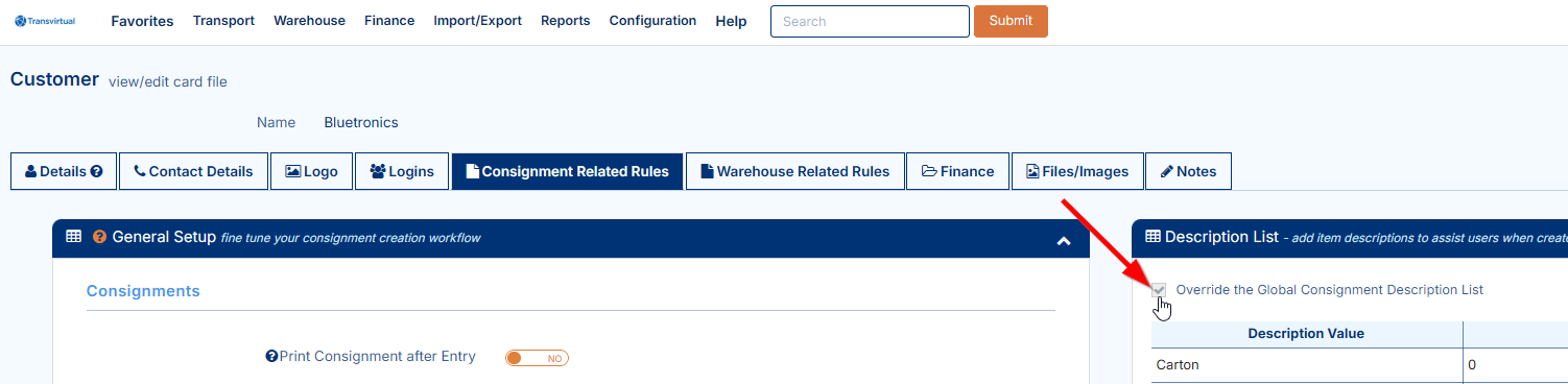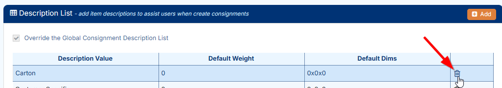 This article will explain how to configure Description Lists to be used upon consignment creation.