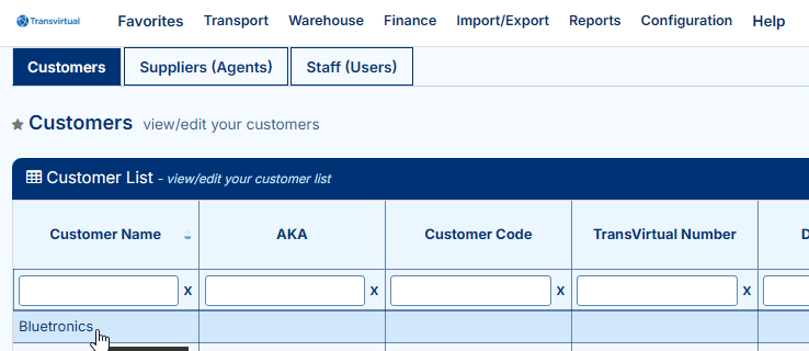 Navigate to Transport > Configuration and Setup > Card Files (Customers/Suppliers/Staff) > Customers tab > Select customer card: