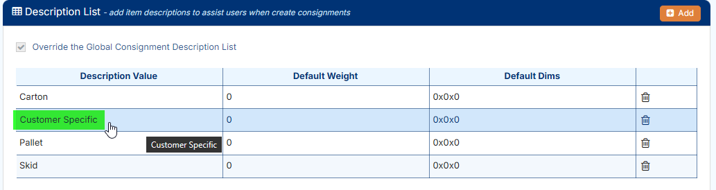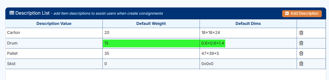This section of Transvirtual allows freight descriptions to be configured. These descriptions are available for users to select when creating consignments, helping to accurately describe the freight being shipped.