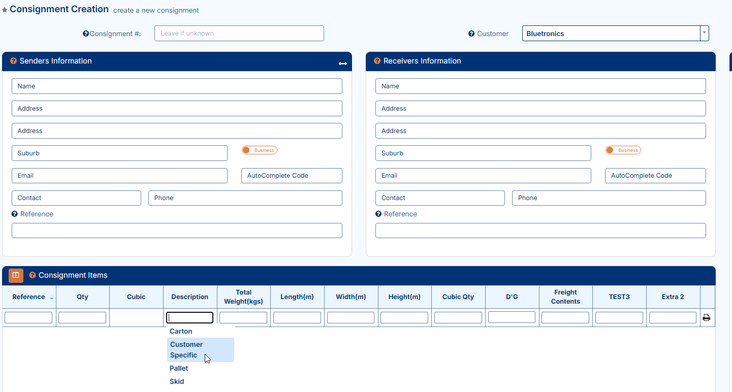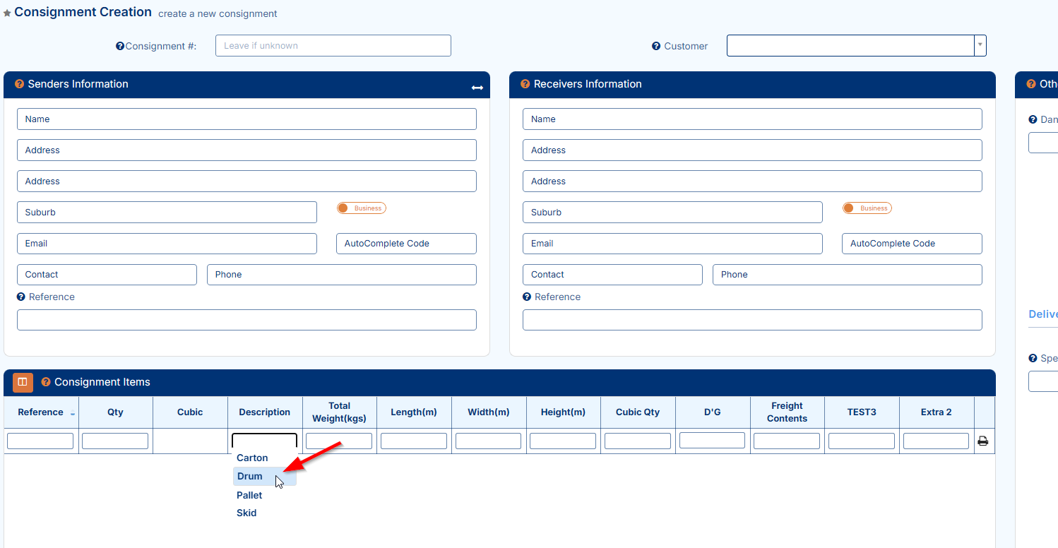 Descriptions entered here can now be utilized within the consignment creation screen under Transport > Operational Tasks > Consignments > Create New: