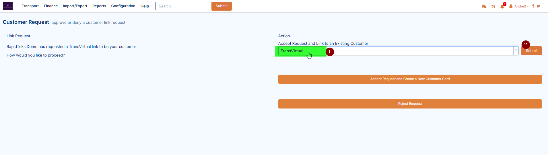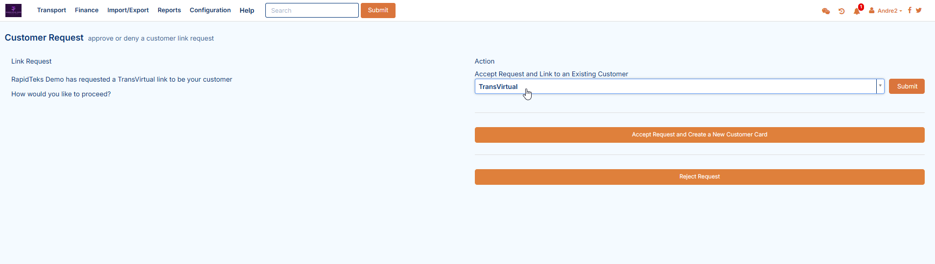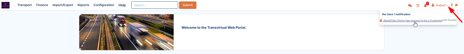To accept a link request from another Transvirtual account, click the dropdown arrow for the login name at the top right: