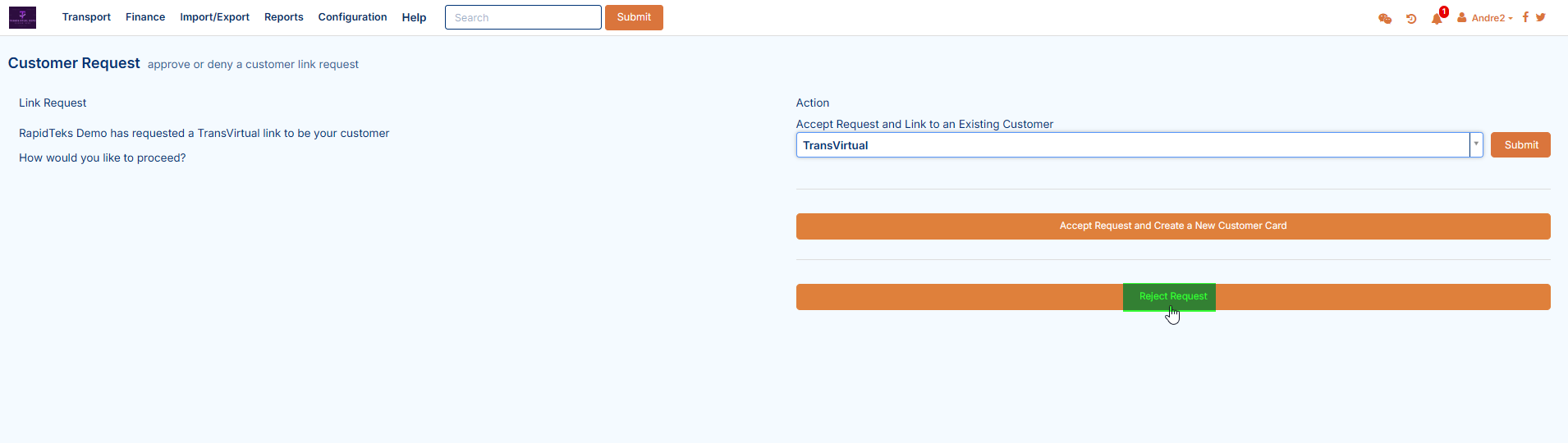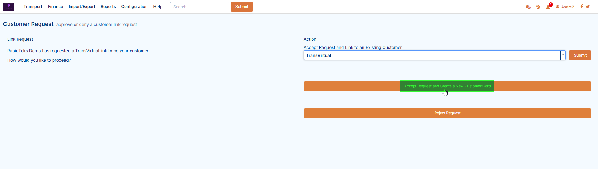 Alternatively, if the requester does not yet have a customer card, click Accept Request and Create a New Customer Card: