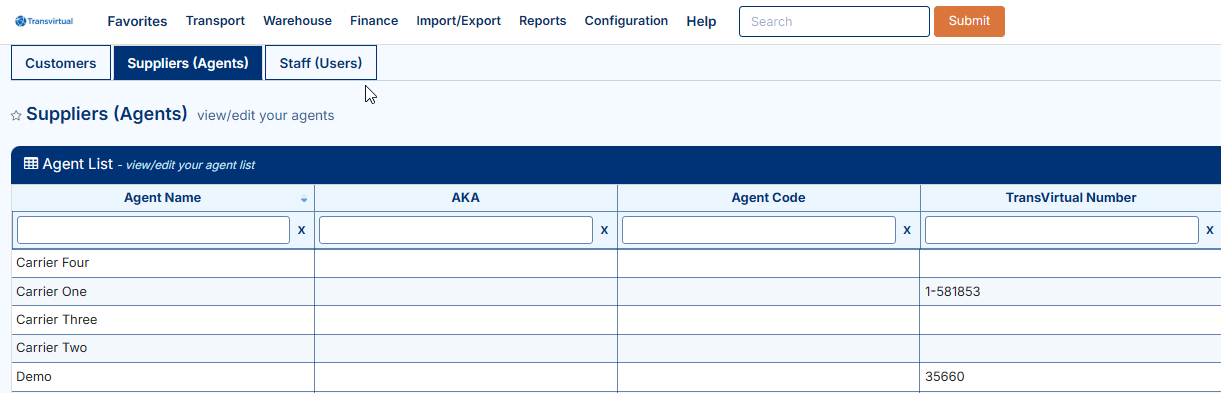 To begin, navigate to the above Page URL which is located under Transport > Configuration and Setup > Card Files (Customers/Suppliers/Staff):