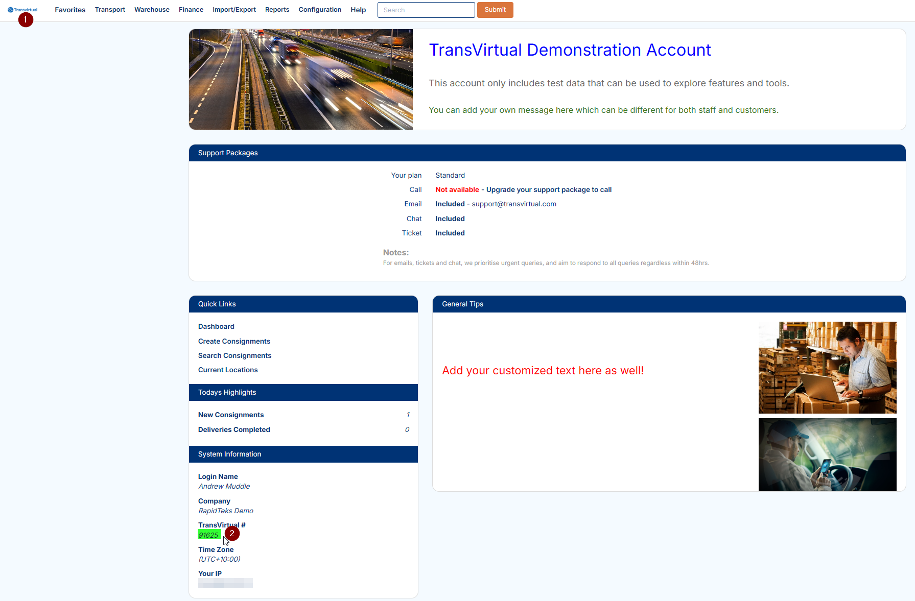 The Transvirtual number of each account is shown on the landing page - click the logo top left, then