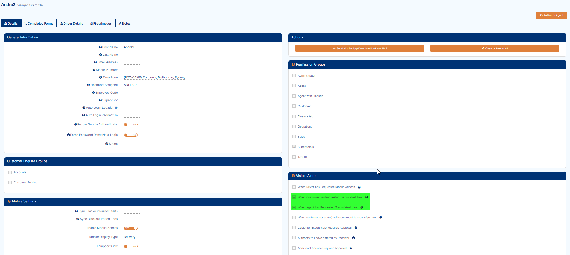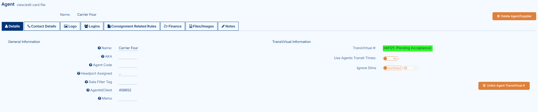 Once the request has been accepted, the link will be established and a Transvirtual number will appear against the relevant card file: