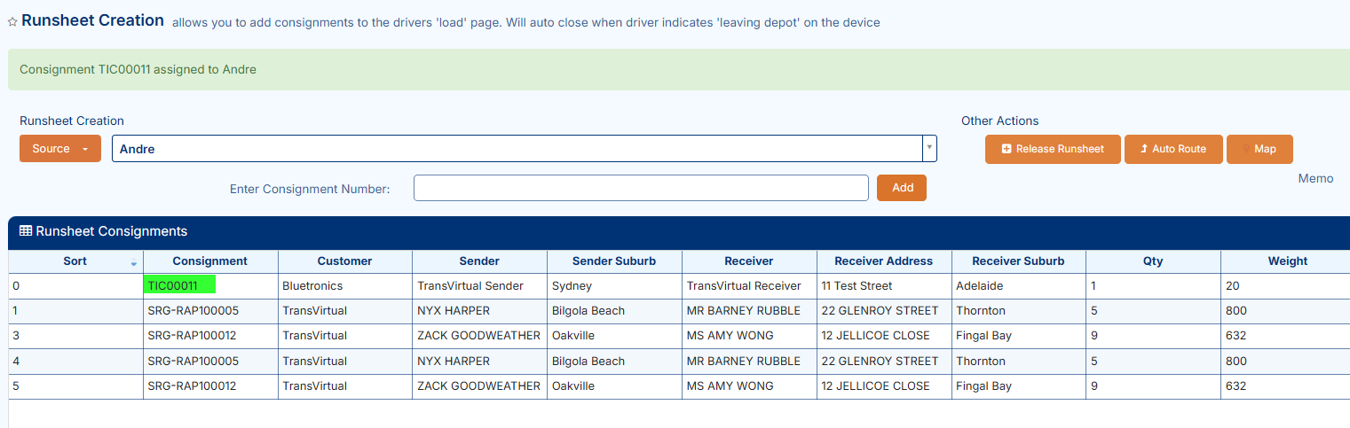 Delivery Assignment via Runsheet Creation