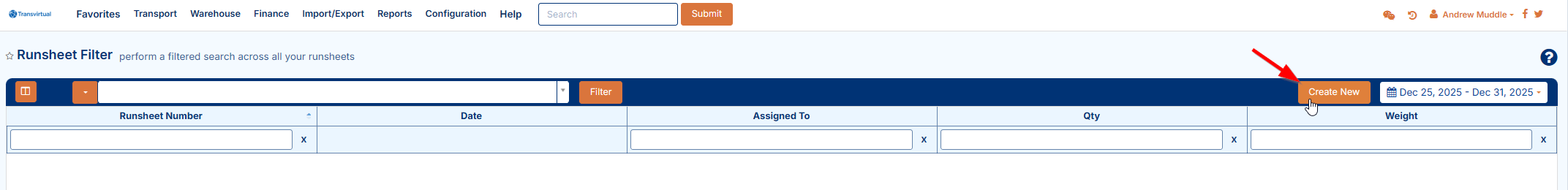 To begin, navigate to the above Page URL which is located under Transport > Operational Tasks > Runsheets > Create New: