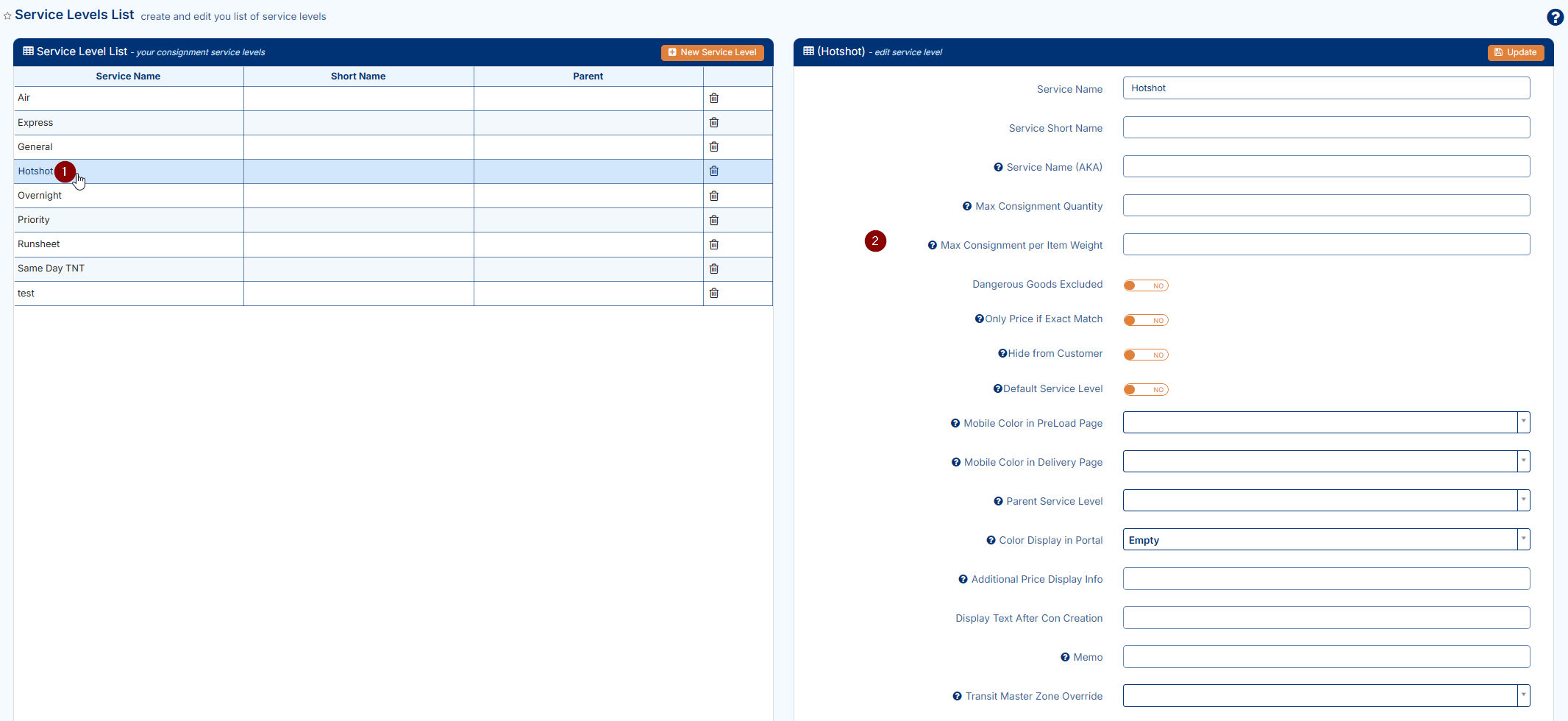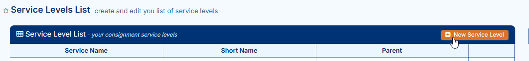 Service levels define the delivery options available in your account (e.g., Standard, Express, Overnight). At least one service level is required.